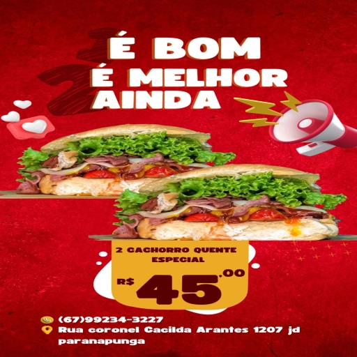 Pão tradicional, maionese, ketchup, hambúrguer tradicional, filé de frango, salsicha, ovo, calabresa, bacon, queijo m... Ver completo